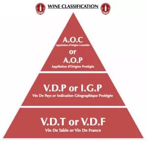 ▲ 法國葡萄酒等級,位于金字塔頂尖的是A.O.C級別,最低端的級別為餐酒(V.D.T)