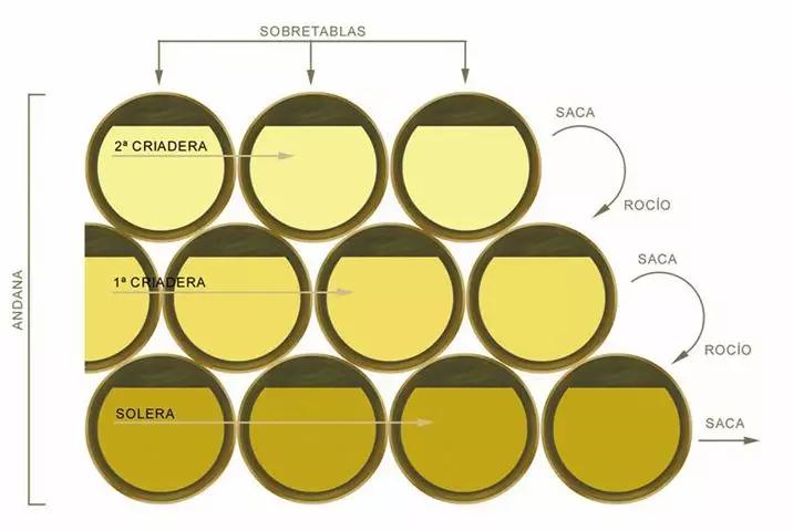 Solera系統的最頂層,儲存著每年的新酒,被稱為Sobretabla層(意為處于放置階段的酒)。而最底層,則與這個系統同名,也叫Solera,這個桶里藏著一整個Solera系統里最老的靈魂。