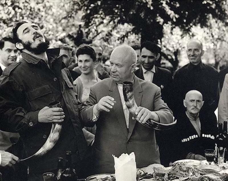 1962年古巴導(dǎo)彈危機(jī),翌年古巴領(lǐng)導(dǎo)人卡斯特羅訪問蘇聯(lián),時任蘇聯(lián)領(lǐng)導(dǎo)人赫魯曉夫在格魯吉亞用獸角杯招待客人。