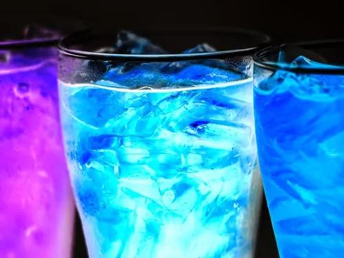 八、活斯布魯:15mL青檸果汁、25mL橙味利口酒、25mL金酒。先用藍色橙味利口酒沾濕古典杯杯口,將杯口沾滿糖粉,杯內放入3塊冰塊,之后將配方中所給材料搖妥后濾入杯中。