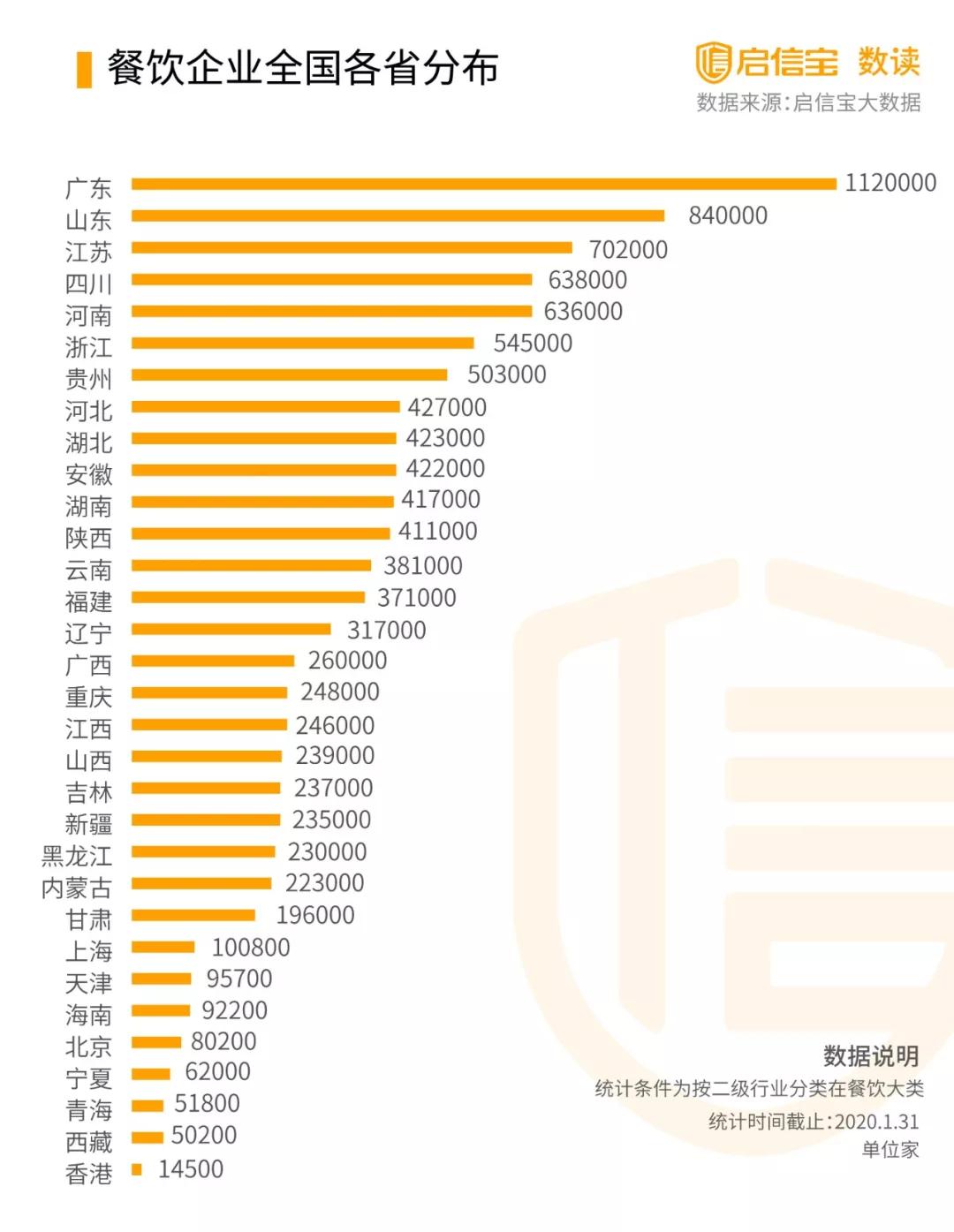 根據啟信寶數據統計,全國共有11114300家有餐飲業務的企業,其中廣東、山東、江蘇分別數量為前三,可能損失會相對較大。