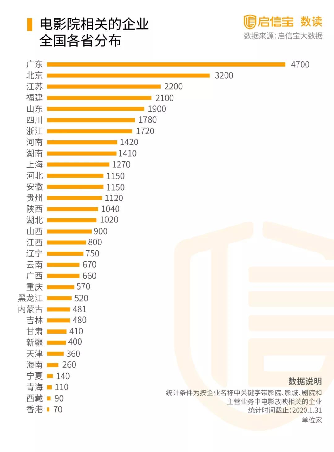 根據啟信寶數據統計,全國共有36262家有影院業務的企業,其中廣東、北京、江蘇分別數量為前三,可能損失會相對較大。