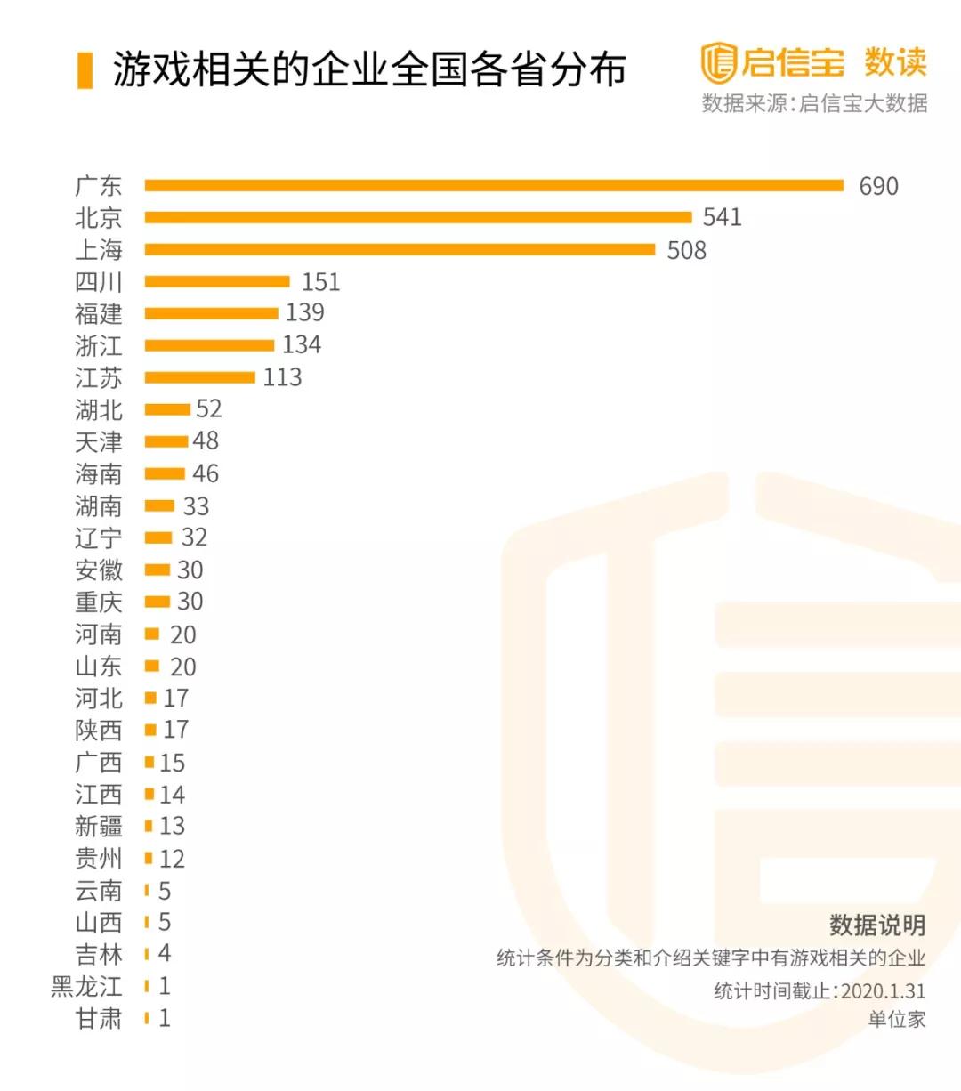 根據啟信寶數據統計,全國共有2693家有游戲業務的企業,其中廣東、北京、上海分別數量為前三,可能受益會相對較大。
