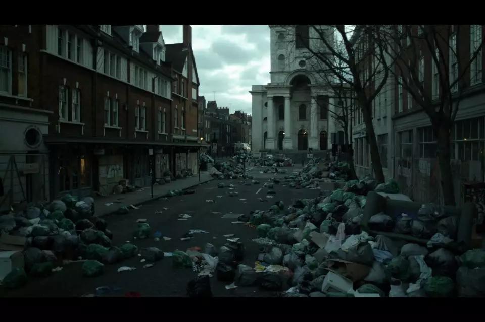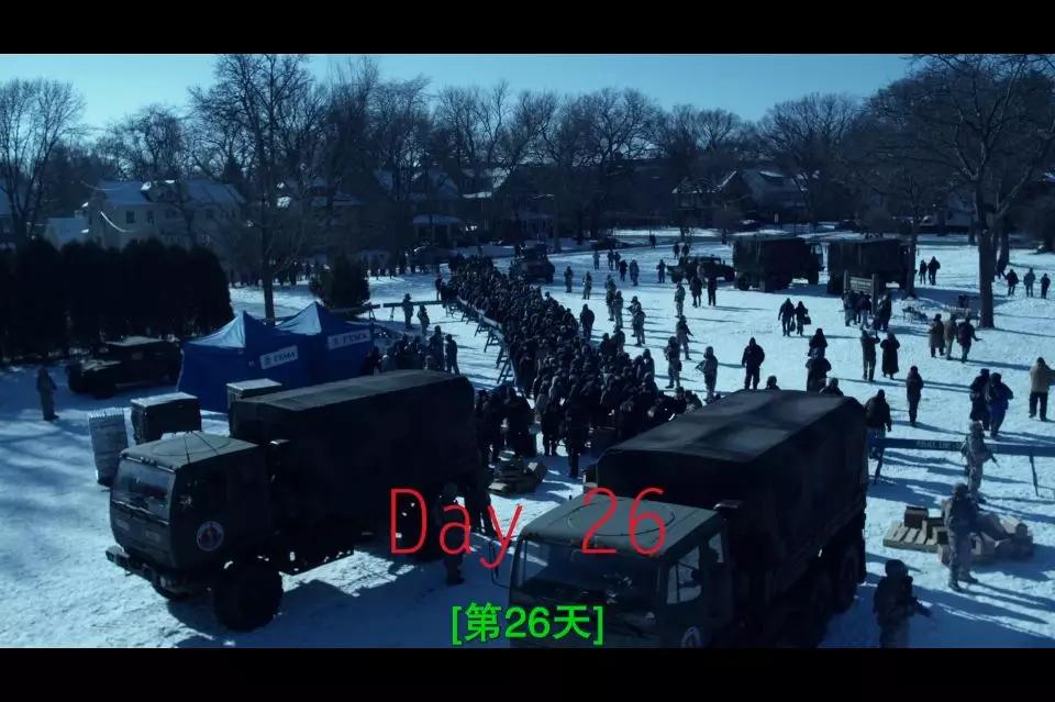 影片中疫情持續下去的情況是:在26天里,經濟回到配給制,人們為了領政府配給的食物排起長長的隊伍。