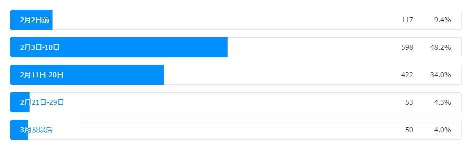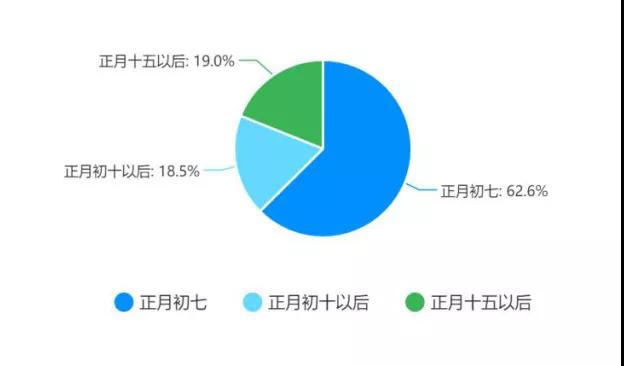 根據(jù)統(tǒng)計(jì)結(jié)果來看,62.6%的企業(yè)在疫情未大范圍傳播時的開工時間為正月初七(國家法定假日結(jié)束),18.5%的企業(yè)開工時間為正月初十后,19%的企業(yè)開工時間為正月十五后,基本上符合春節(jié)假期的主流放假時間。