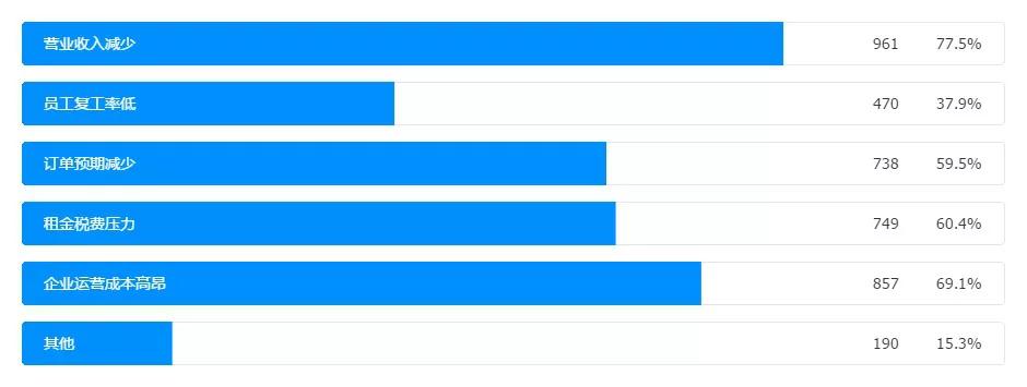 結(jié)合上述第6個問題數(shù)據(jù),分析可以看出,當(dāng)前受疫情影響員工復(fù)工率低,導(dǎo)致企業(yè)既不能進(jìn)行正常的復(fù)工,還要承擔(dān)員工的工資及五險一金開支,直接造成了入不敷出的困難情況。