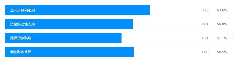 根據(jù)數(shù)據(jù)可以看出,參與調(diào)查的企業(yè)認(rèn)為,當(dāng)前企業(yè)主要面臨的經(jīng)營困難主要是集中在資金等問題上,面對收入急劇減少,人工成本反而增高的前提下,大多數(shù)民營企業(yè)最需要的,是更多的稅費(fèi)減免及政府補(bǔ)貼支持。