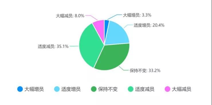 現(xiàn)有數(shù)據(jù)可以看出,當(dāng)前企業(yè)對于企業(yè)發(fā)展的態(tài)勢都持觀望態(tài)度,導(dǎo)致企業(yè)在用工方面體現(xiàn)出比較保守的選擇:超過33%的企業(yè)將會保持本企業(yè)的用工情況,不進(jìn)行進(jìn)一步的擴(kuò)張,而超過35%的企業(yè)將會通過適度裁員的情況來緩解當(dāng)前企業(yè)的困境。值得注意的是,有8%的企業(yè)表示將會以大幅裁員緩解企業(yè)困境,可見企業(yè)對于本次疫情對于經(jīng)濟(jì)的負(fù)面影響普遍比較擔(dān)心。