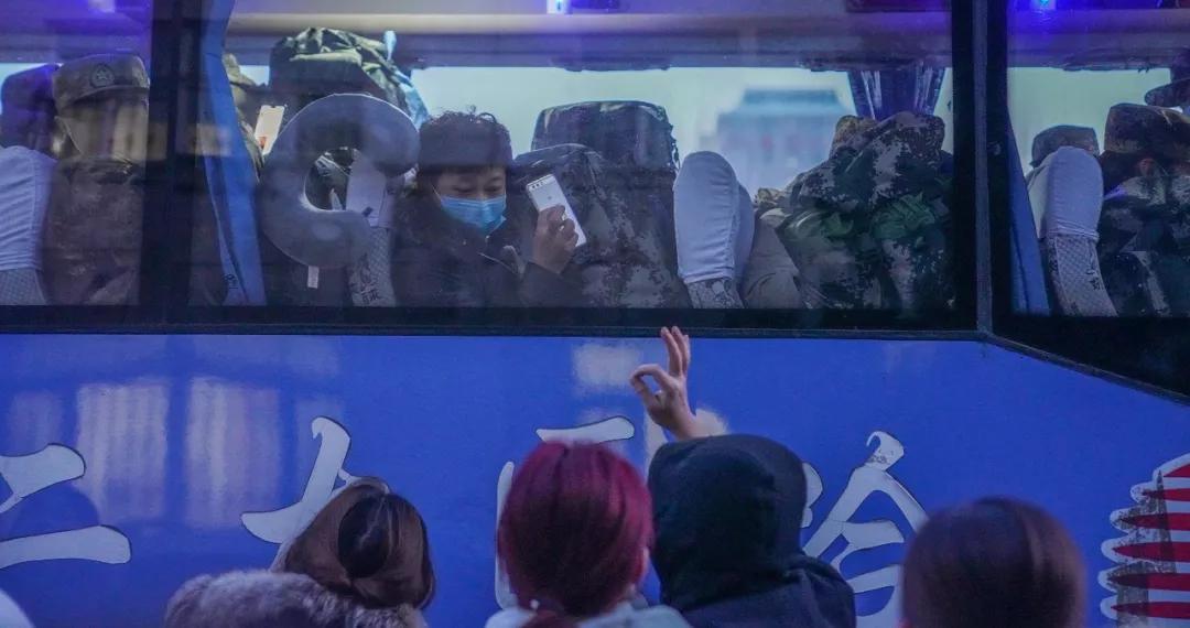2020年1月27日下午3時許,在哈醫大二院,黑龍江省首批援助武漢醫療隊的成員們即將出發。車上的醫療隊員與家人依依惜別。