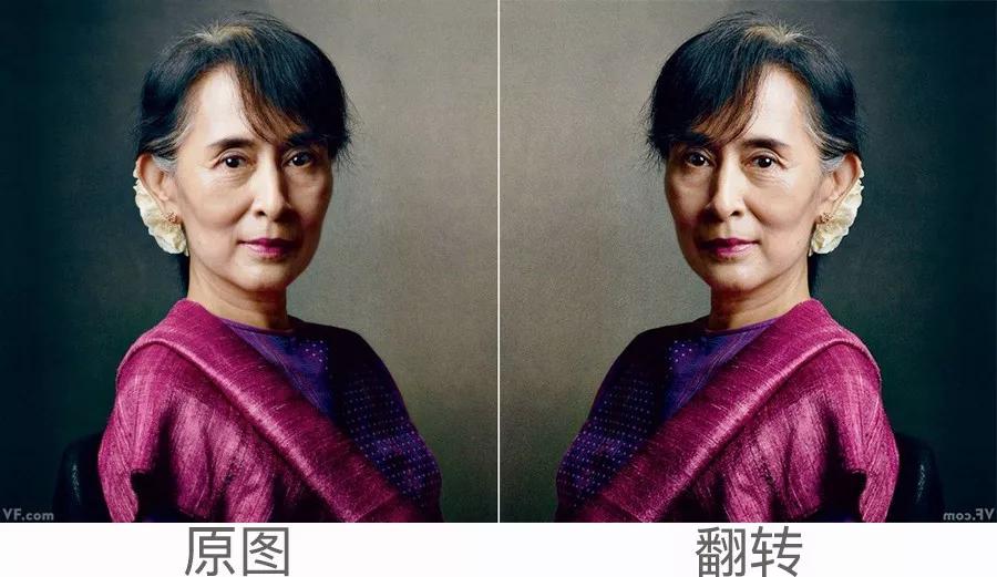 人物面部朝右,視覺情感傾向是積極昂揚的,與人物的整體姿態極為貼合。我們將其翻轉,會感覺到強烈的不和諧感。