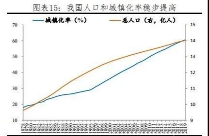 2019年城鎮化率達60.60%,比上年末提高1.02個百分點,保持穩步增長態勢,較高收入經濟體的81.3%仍有20個百分點的空間。過去四十年,中國城鎮常住人口從1.7億快速增至8.5億,凈增加6.8億,城鎮化率從17.9%提升至60.6%,提高43個百分點,深刻地改變了中國經濟社會格局,成就了過去中國重化工業、大規?;A設施投資、房地產、消費升級等的飛速發展。