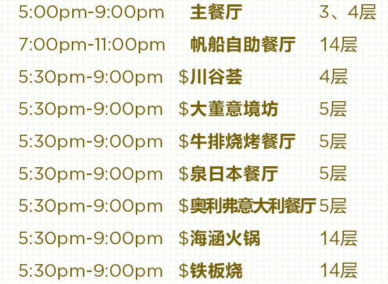 至于收費餐廳,無論是鐵板燒、大董意境坊、牛排燒烤餐廳還是海涵火鍋,都是只有在晚餐時段才會開放的呢~