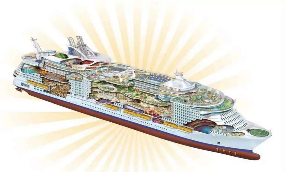 從總噸位來說,現代世界上最大郵輪無疑是皇家加勒比郵輪公司總噸位超過22萬綠洲級系列郵輪。
