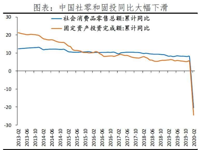 以中國(guó)為例,2020年1-2月,中國(guó)社會(huì)消費(fèi)品零售總額和固定資產(chǎn)投資完成額累計(jì)同比分別從2019年12月的8.0%和5.4%下滑至-20.5%和-24.5%,工業(yè)增加值累計(jì)同比從5.7%下滑至-13.5%,2月制造業(yè)PMI從1月的50.0下滑至35.7,均創(chuàng)數(shù)據(jù)公布以來的最低值,遠(yuǎn)超2003年SARS和2008年國(guó)際金融危機(jī)。一季度GDP大概率負(fù)增長(zhǎng)。