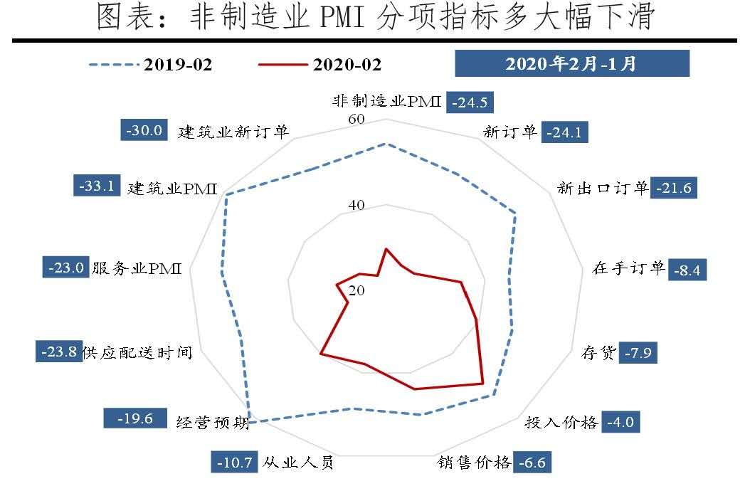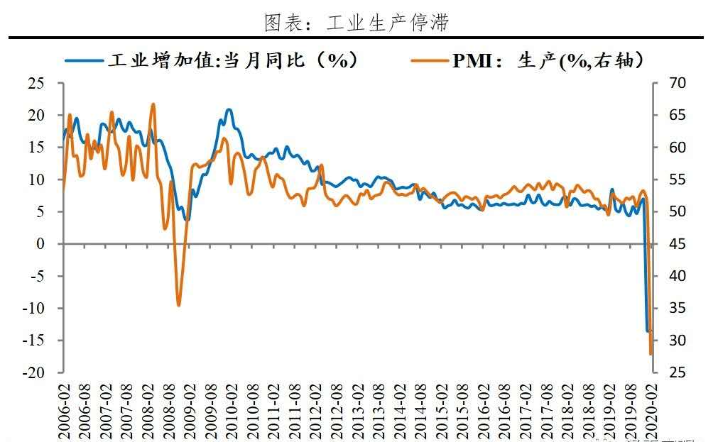 2月制造業(yè)PMI指數(shù)為35.7%,較上月大幅下滑14.3個百分點,低于2008年11月全球金融危機時的38.8%。分項來看:1)生產(chǎn)放緩。2月PMI生產(chǎn)指數(shù)為27.8%,較上月大幅下滑23.5個百分點,與疫情沖擊下企業(yè)延遲復(fù)工、生產(chǎn)停滯有關(guān)。2)內(nèi)外需求疲弱。2月新訂單和新出口訂單指數(shù)分別為29.3%和28.7%,分別較上月大幅下滑22.1和20.0個百分點。3)價格指數(shù)下滑,企業(yè)虧損和通縮風險加大。2月原材料和出廠價格指數(shù)分別為51.4%和44.3%,較上月分別下滑2.4和4.7個百分點。出廠價格和原材料價格指數(shù)差值擴大,中下游企業(yè)盈利壓力加大。4)采購量和經(jīng)營預(yù)期指數(shù)大幅下滑,原材料庫存大降、產(chǎn)成品庫存積壓。2月原材料庫存指數(shù)較上月下滑13.2個百分點,后期有較強補庫存需求;產(chǎn)成品庫存指數(shù)較上月上升0.1個百分點,反映疫情期間物流堵塞、消費放緩導(dǎo)致的庫存積壓。5)大中小型企業(yè)PMI均大幅下滑,中小企業(yè)受沖擊更大。2月大中小型企業(yè)PMI指數(shù)分別為36.3%、35.5%和34.1%,較上月分別下滑14.1、14.6和14.5個百分點。