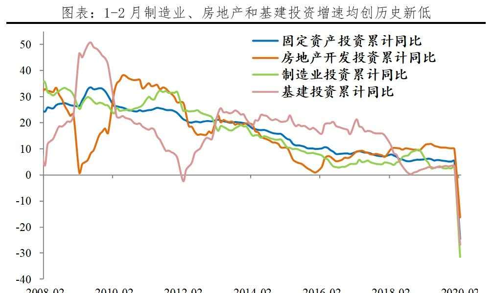 固定資產(chǎn)投資增速創(chuàng)歷史新低,民間投資下滑幅度更大。1-2月固定資產(chǎn)投資累計同比-24.5%,較去年全年下滑29.9個百分點,較去年12月當月同比下滑36.3個百分點,創(chuàng)歷史新低。分產(chǎn)業(yè)看,第一、二、三產(chǎn)業(yè)投資同比分別為-25.6%、-28.2%、-23.0%,分別較去年全年下滑26.2、31.4、29.5個百分點。分地區(qū)看,東部、中部、西部、東北地區(qū)同比分別為 -20.2%、-32.7%、-25.0%、-18.9%,分別較去年全年下滑24.3、42.0、30.6、21.9個百分點。從投資主體看,民間固定資產(chǎn)投資同比-26.4%,較去年全年下滑31.3個百分點,下滑幅度大于整體。