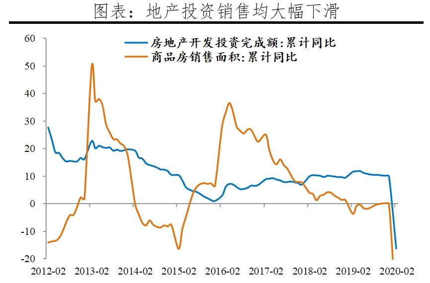 1-2月房地產(chǎn)投資累計同比-16.3%,較去年12月下滑23.7個百分點,創(chuàng)歷史新低。1)土地購置負增長,但土地溢價率較去年三四季度有所恢復(fù)。部分百強企業(yè)前兩月在土地市場零投資,1-2月土地購置面積累計同比-29.3%,較去年12月下滑36.8個百分點。據(jù)中指院數(shù)據(jù),1-2月300城土地平均成交溢價率分別為11.6%和11.1%,而去年三四季度分別為10%和9%,300城住宅用地流拍面積減少37%。2)新開工、竣工增速均暴跌。1-2月新開工面積、施工面積、竣工面積累計同比分別為-44.9%、2.9%、-22.9%,分別較12月下滑52.3、6.2和43.1個百分點。3)庫存去化速度放緩,但仍處歷史低位。1-2月商品房待售面積累計同比為1.4%,較12月上升5.2個百分點,但由于此前庫存去化充分,當前商品房待售面積仍為近五年低位水平。未來復(fù)工推進、地產(chǎn)銷售復(fù)蘇、加快期房竣工和舊改等,將托底房地產(chǎn)投資。