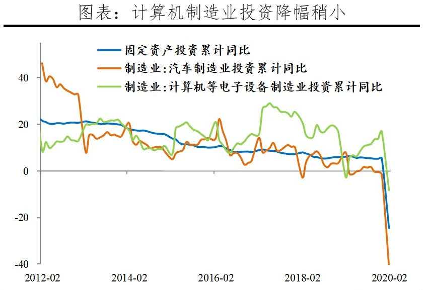 41個大類行業(yè)中僅油氣開采和煙草2個行業(yè)增加值同比正增長,612種產(chǎn)品中僅79種產(chǎn)品同比增長,部分高技術(shù)產(chǎn)品保持較快增長。而在去年12月,41個行業(yè)中有33個正增長,605種產(chǎn)品有365種正增長。1)1-2月汽車工業(yè)重回負增長,同比-31.8%,較12月大幅下滑42.2個百分點。分車型產(chǎn)量看,SUV、轎車和新能源車產(chǎn)量同比分別為-41.3%、-49.8%和-62.8%。2)出口相關(guān)產(chǎn)業(yè)電氣機械、金屬制品、通用設(shè)備、專用設(shè)備、橡膠塑料和紡織工業(yè)增加值同比分別為-24.7%、-26.9%、-28.2%、-24.4%、-25.2%和-27.2%,分別下滑37.1、33.2、33.1、30.9、28.9和27.4個百分點。3)鋼鐵有色等連續(xù)生產(chǎn)型行業(yè)降幅稍小。有色和黑色金屬冶煉同比分別為-8.5%和-2%,分別下滑13.5和12.7個百分點。4)疫情提振醫(yī)療防護和生活物資需求,口罩、發(fā)酵酒精產(chǎn)量同比分別為127.5%和15.6%,凍肉和方便面同比分別為13.5%和11.4%。5)部分高技術(shù)產(chǎn)品智能手表、智能手環(huán)、半導(dǎo)體分立器件和集成電路產(chǎn)量同比分別為119.7%、45.1%、31.4%和8.5%。分地區(qū)看,東部、中部、西部和東北地區(qū)同比分別為-16.9%、-16.7%、-7.6%和-11.5%,分別較12月下降23.8、23.4、15.4和20.5個百分點。