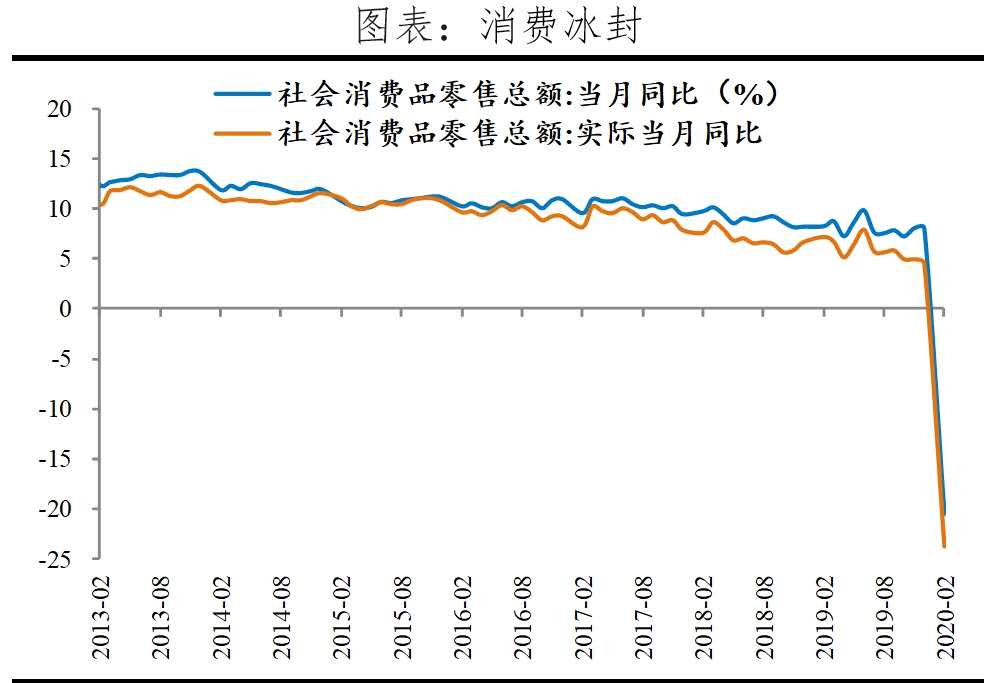 消費冰凍,僅糧油食品、飲料、藥品等少數(shù)維持正增長。1-2月社會消費品零售總額名義和實際增速分別為-20.5%和-23.7%,分別較去年12月大幅下滑28.5和28.2個百分點,均創(chuàng)1995年公開數(shù)據(jù)以來的歷史新低;除汽車外社會消費品零售額同比-18.9%,下滑19.7個百分點。從消費品類看,餐飲消費接近腰斬,汽車、石油及制品和地產(chǎn)相關(guān)消費品大幅下滑,糧油食品類消費保持增長。1)1-2月餐飲和商品消費同比分別為-43.1%和-17.6%,分別較12月下滑52.2和25.5個百分點。2)因出行需求大幅減少,汽車、石油及制品消費同比分別為-37.0%、-26.2%,分別下滑38.8和30.2個百分點。3)家具、家用電器和建筑裝潢材料消費增速分別為-33.5%、-30%和-30.5%,分別下滑35.3、32.7和31.1個百分點。4)升級類消費品珠寶、服裝和化妝品類消費同比分別為-41.1%、-30.9%和-14.1%,分別下滑44.8、32.8和26個百分點。5)實物商品網(wǎng)上零售額增速3%,較2019年下滑16.5個百分點。其中,吃、穿、用類增速分別為26.4%、-18.1%、7.5%,分別下滑4.5、33.5和12.3個百分點;必需消費品糧油食品類消費增速9.7%,與12月持平。從消費區(qū)域看,城鎮(zhèn)和農(nóng)村消費增速分別為-20.7%和-19%,分別較12月下滑28.5和28.1個百分點。