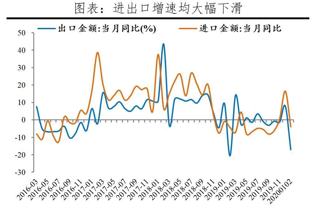 出口大幅下滑,主因疫情導(dǎo)致部分國家對華貿(mào)易管制以及國內(nèi)企業(yè)延遲復(fù)工;進口增速下滑幅度不及出口,貿(mào)易差額由正轉(zhuǎn)負。1-2月中國出口(以美元計)累計同比-17.2%,較去年12月下滑25.1個百分點;進口(以美元計)累計同比-4.0%,下滑20.5個百分點;貿(mào)易差額-71億美元,減少543.1億美元。出口方面,對主要地區(qū)均不同程度下滑,勞動密集型產(chǎn)品出口下滑幅度最大。1-2月中國對美國、歐盟、日本、東盟、中國香港和韓國的出口累計同比分別為-27.7%、-18.4%、-24.5%、-5.1%、-20.4%和-18.6%,均較去年12月下滑10個百分點以上;七大勞動密集型產(chǎn)品、機電產(chǎn)品和高新技術(shù)產(chǎn)品出口累計同比分別為-26.3%、-16.2%和-15.2%,均下滑15個百分點以上。進口方面,大宗商品進口同比較上月上升。1-2月農(nóng)產(chǎn)品、機電產(chǎn)品、高新技術(shù)產(chǎn)品進口累計同比分別為5.1%、-7.4%、-5.4%,均較12月下滑20個百分點以上;大宗商品進口累計同比為15.0%,較12月上升3.8個百分點。
