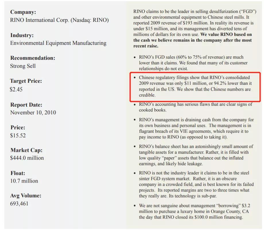 這份報告指出,綠諾科技在2010年的收入為1100萬美元,比其在美國公布的1.93億美元足足低了94.2%。