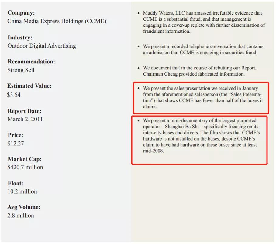 這份報告指出,中國高速頻道擁有的公交車數量,只有他們數據的一半;另外,他們對外宣布的最大一份合同,壓根兒就沒簽。