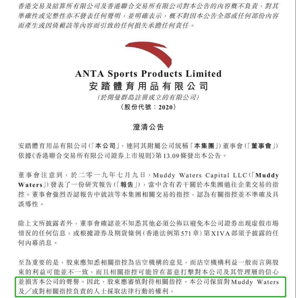 7月10日,渾水公司發布第三篇針對安踏的沽空報告。