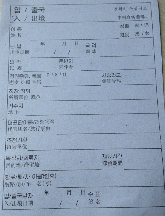 從北京或沈陽直飛平壤的方式入境朝鮮會在護照上留有朝鮮貼紙簽證,但是,如果乘火車、巴士入境都不會在護照上留下朝鮮貼紙簽證的??!只會留下中國邊檢的出入境印章。