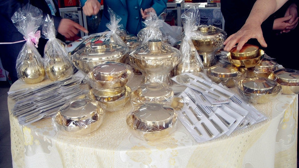 雖然朝鮮整體的生活水平不高,但在專對外國人開放的小賣部或者紀念品店,商品的價格并不低。朝鮮特色的純銅筷子(一雙)+勺子(一個),每套根據份量不同,有20元和25元人民幣兩種價格,一套銅碗260元人民幣,40度的高麗人參酒100元人民幣/瓶,一瓶朝鮮特色辣醬20元人民幣,一件紀念T恤100元人民幣。