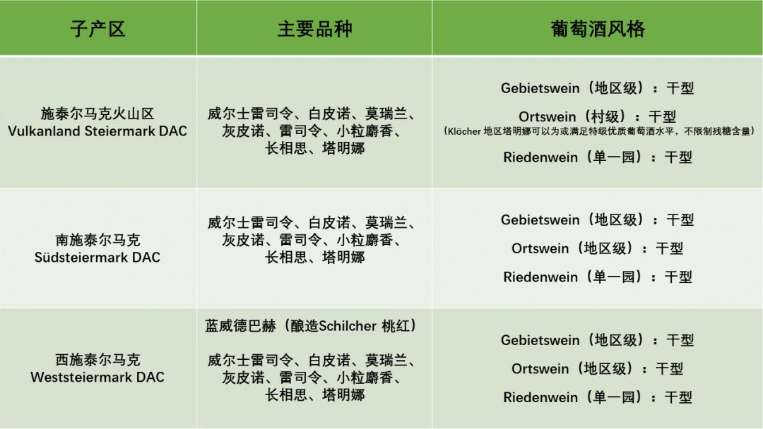 雖然擁有3個子產區(全部為DAC),然而施泰爾馬克的產量僅占了全國產量的7%,并且絕大多數都是白葡萄酒(西施泰爾馬克出產一種極具特色的Schilcher桃紅)。