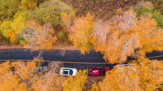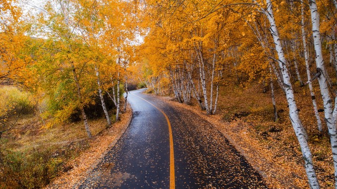 很多人都認為金秋九月的草原都是枯黃的草,毫無亮點,但是唯獨烏蘭布統草原與眾不同,9月初,軍馬場開始慢慢變換色彩,從茵茵綠草慢慢變得金黃遍野,而秋日的白樺林是最值得期待的,她宛若一個亭亭玉立的少女,白色的樹干筆直俊秀,金黃的葉子如蝴蝶翩翩起舞。10月秋風蕭瑟,樹葉紛紛凋零,滿地金黃,此時來烏蘭布統又是另一番景象了 。一般情況下,每年的9月中旬到十一黃金周,都是壩上流光溢彩之最的時候,看漫山遍野,層林盡染,斑斕的色彩讓人心醉。