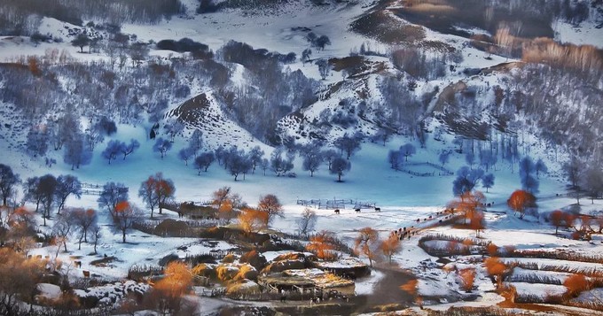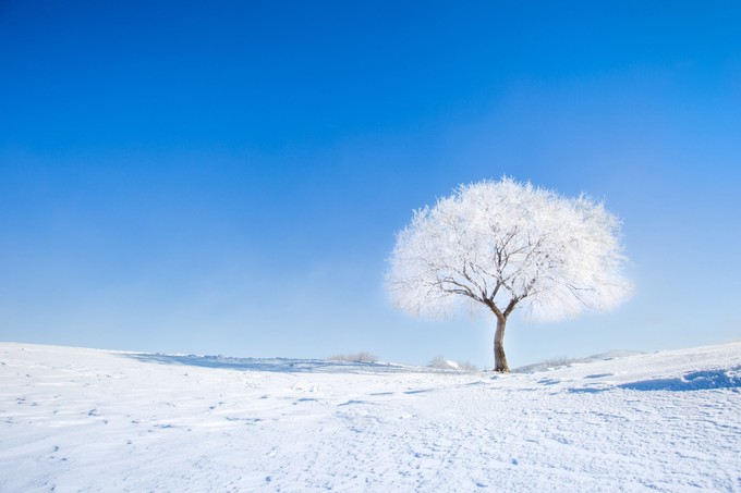 冬季的烏蘭布統儼然是一個白雪皚皚,銀裝素裹的冰雪童話世界,越野車進入塞罕壩森林公園時,道路兩邊都是鱗次櫛比的筆直的參天大樹(估計是松柏類),白茫茫的一片,甚至有幸一睹雪白的狐貍,或許是太冷了外出覓食,但是并沒有停留很久就不見了蹤跡,讓人懷疑是否出現過。這里沒有雪鄉著名的冰雪蘑菇屋,但這里有小河頭的雪饅頭;這里沒有哈爾濱五彩繽紛的冰雕王國,但這里有小巧精致的冰燈。這里的霧凇甚至比我12年在霧凇島看到的都要壯觀,唯美。