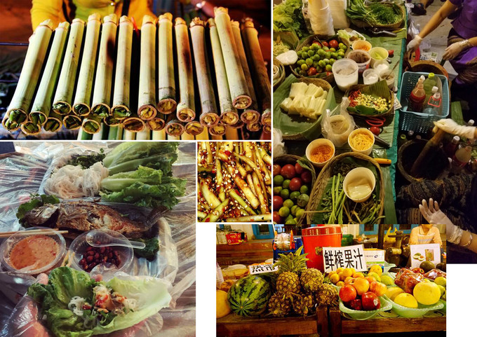 例如香茅草烤魚、考五花肉、烤雞、菠蘿飯、野菜湯、風味煮米干、喃咪拼盤都非常值得一試。特具風味的野菜,不僅美味,四季皆不同。你要是選擇雨季來版納,不僅有山茅野菜、筍類,還有野生菌類和讓你勇于挑戰的蟲類,豐富的程度絕對讓你咂舌。