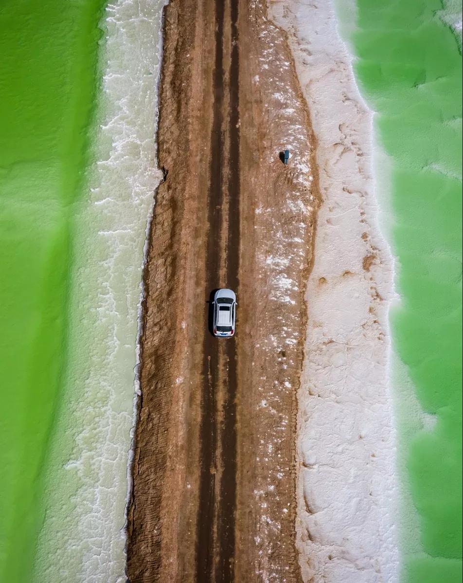 東臺(tái)吉乃爾湖的神奇之處在于一條泥路將湖水一分為二,一半是純正的蒂芙尼藍(lán),一半是含鹽量極高的純粹綠;乃爾湖岸邊盡是覆蓋著的白色結(jié)晶,湖周圍是大片的雅丹地貌,搭配上顏色干凈到極致的湖水、西北特有的廣闊無(wú)垠的天空,純粹而強(qiáng)烈的視覺沖擊,這方圓百里大漠戈壁無(wú)人區(qū)的珍寶明珠,這只屬于大自然的神秘顏色,讓你仿若來(lái)到了世界的盡頭,讓你感受一種歸于自然的內(nèi)心平靜。