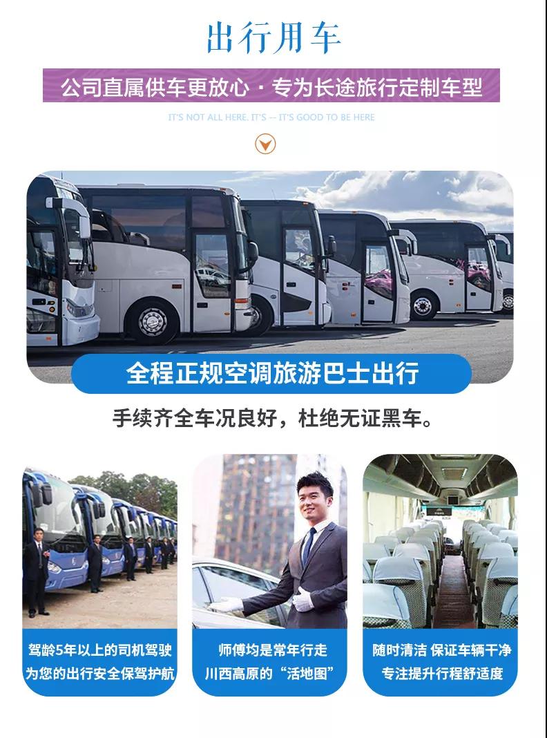 1、關于車輛交通:目前四川旅游市場8座以下車輛無法辦理旅游牌照,請游客知悉,以此理由提起的投訴我方拒不受理,望您諒解。