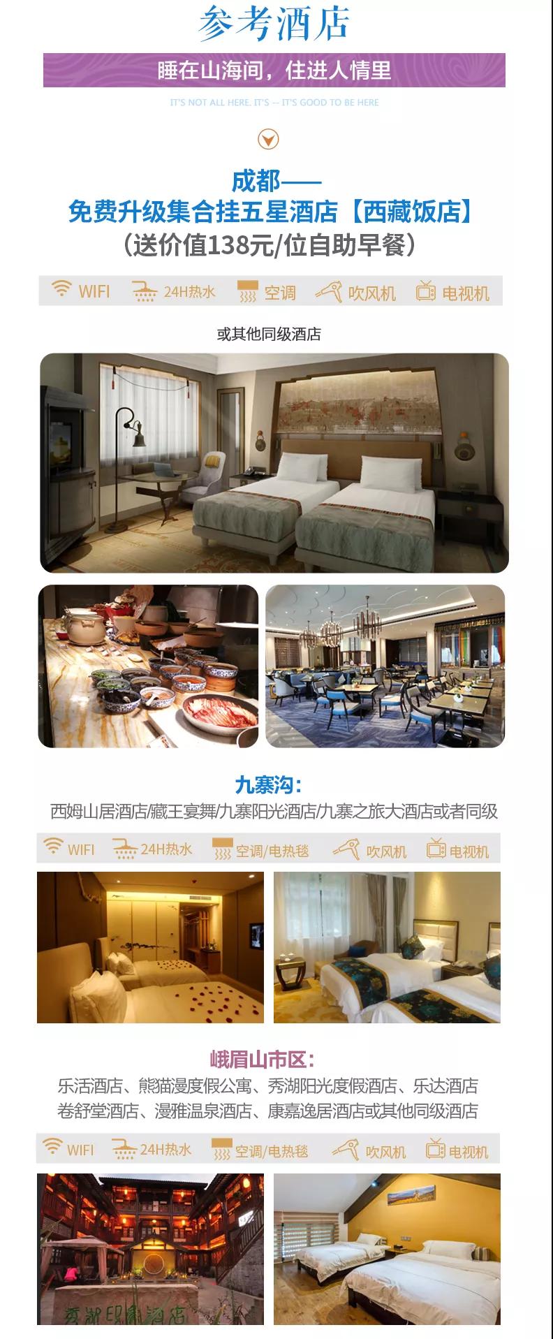 ? 住宿:含全程5晚舒適酒店標間,免費升級2晚成都集合掛五酒店(西藏飯店)。參考酒店如下: