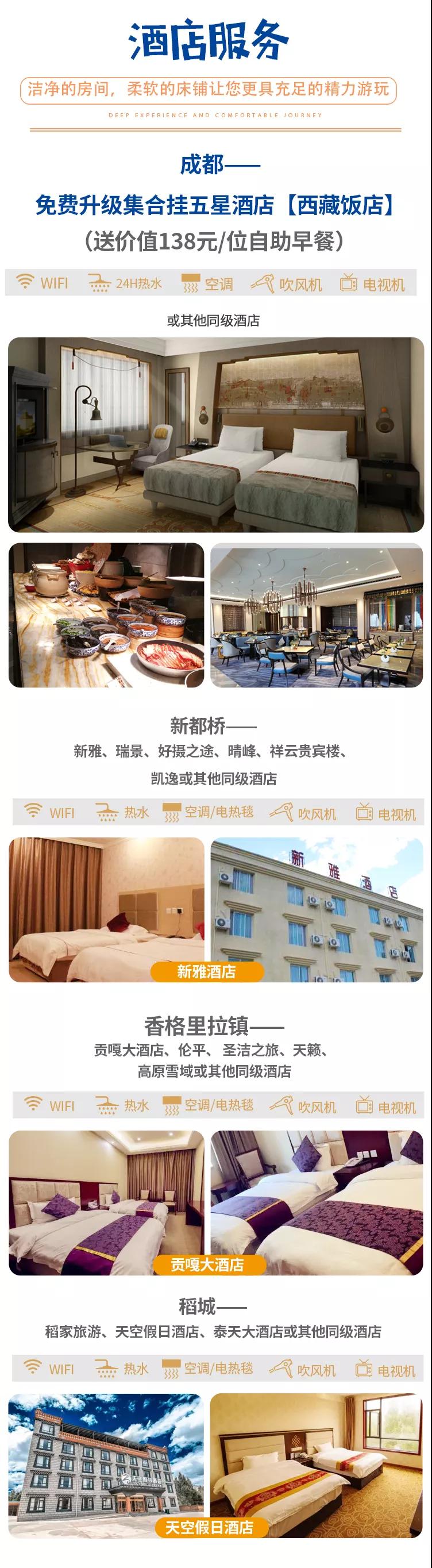 住宿:含全程6天5晚舒適酒店;免費升級出行前成都集合掛五酒店西藏飯店一晚。參考酒店如下(僅供參考,實際以訂房為準):