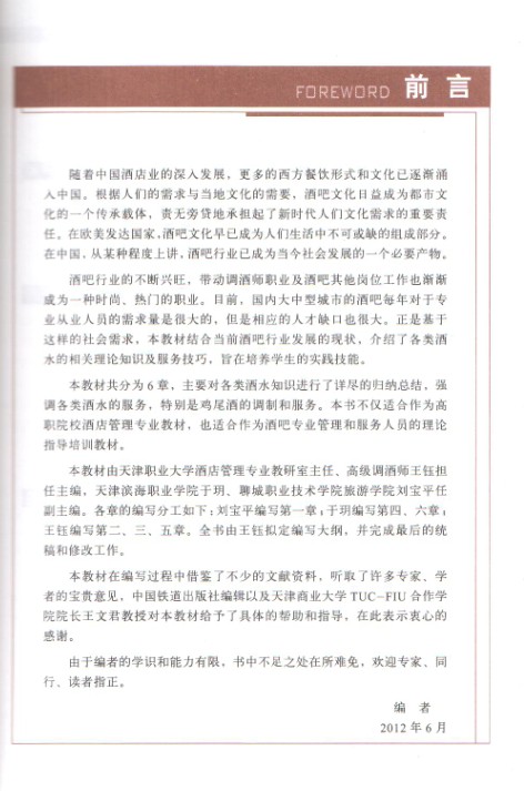 【網(wǎng)宣部】“全國(guó)優(yōu)秀導(dǎo)游員”/國(guó)家級(jí)“高級(jí)調(diào)酒師”劉寶平繼參編教材《旅行社經(jīng)營(yíng)管理》出版后,副主編教材《酒水知識(shí)與服務(wù)技巧》于2012年10月出版,本教材結(jié)合當(dāng)前酒吧行業(yè)發(fā)展的現(xiàn)狀,介紹了各類酒水的相關(guān)理論知識(shí)及服務(wù)技巧,旨在培養(yǎng)學(xué)生的實(shí)踐技能。教材共分為6章,(劉寶平編寫第一章),主要對(duì)各類酒水知識(shí)進(jìn)行了詳盡的歸納總結(jié),強(qiáng)調(diào)各類酒水的服務(wù),特別是雞尾酒的調(diào)制和服務(wù),本書不僅適合作為高職院校酒店管理專業(yè)教材,也適合作為酒吧專業(yè)管理和服務(wù)人員的理論指導(dǎo)培訓(xùn)教材。