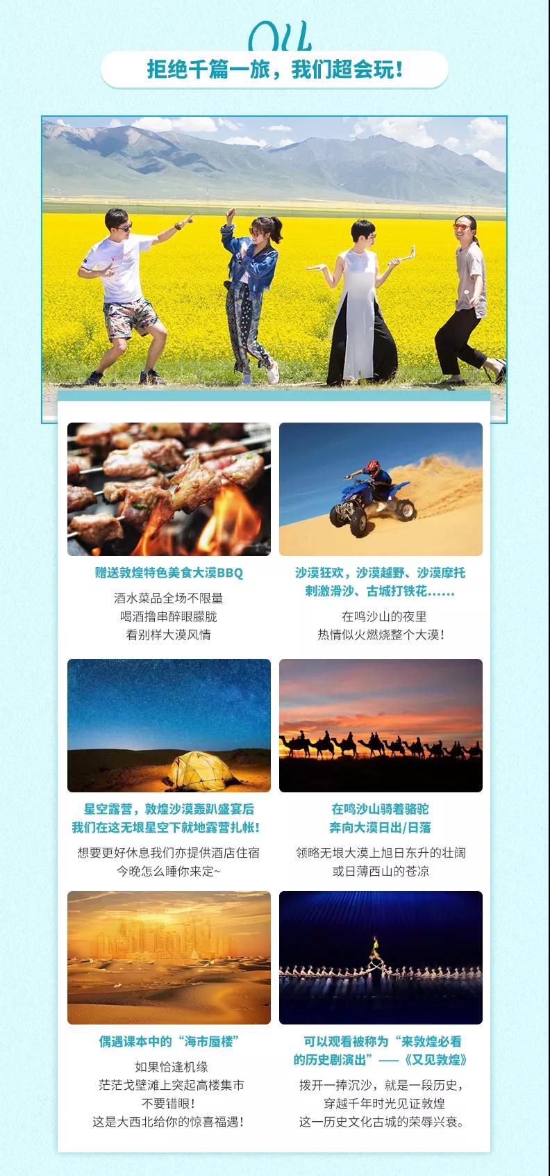 溫馨提示:西北地區(qū)天氣干燥,旅途的過程中請大家多喝水,注意防曬;敦煌《又見敦煌》演出,旅游淡季298元/人,旺季368元/人起;果木烤全羊費(fèi)用根據(jù)羊的大小決定,由參與活動(dòng)的游客均攤,一般10人一桌,人均消費(fèi)160元左右。