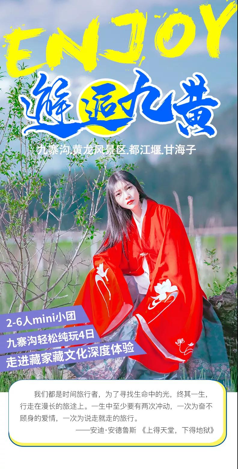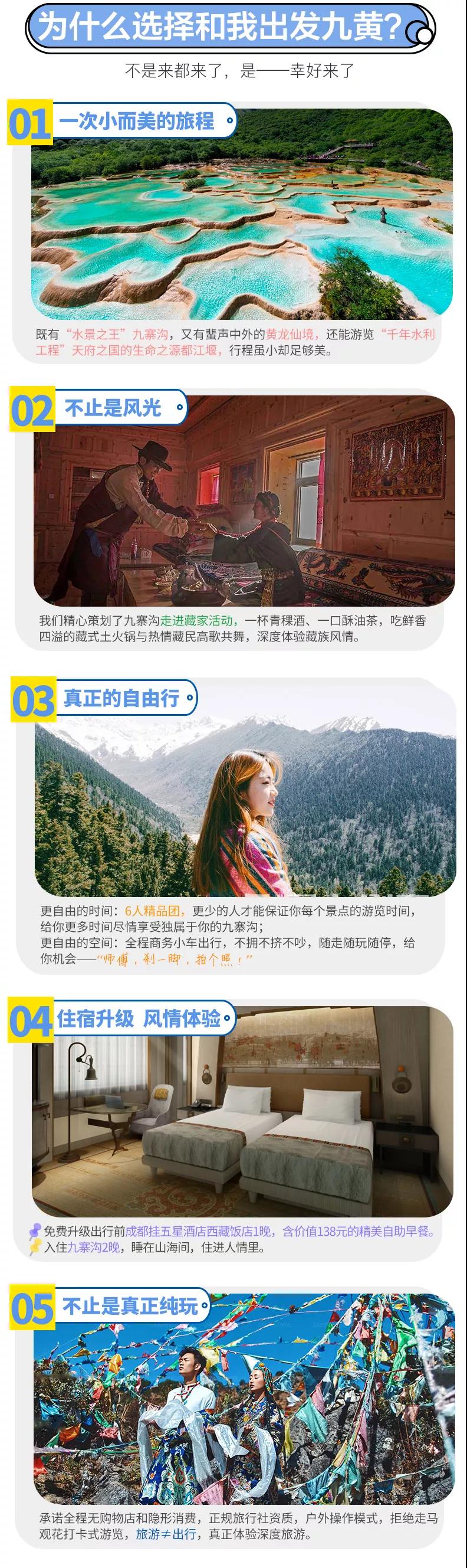 4、九寨溝景區(qū)實行分區(qū)域開放,開放區(qū)域為溝口經(jīng)諾日朗瀑布至長海,扎如溝的扎如寺及日則溝的鏡海;其中,長海、五彩池、鏡海、諾日朗瀑布、樹正群海、雙龍海瀑布、扎如寺等景觀原則上為步行游覽區(qū),具體游覽方式請聽從隨車講解員安排。