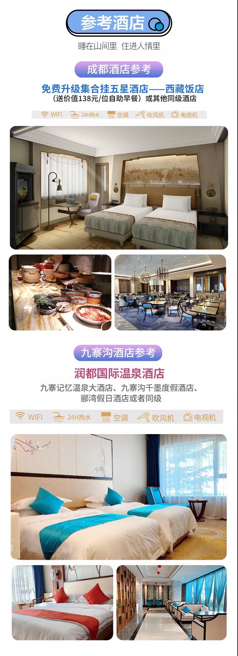 3.住宿:含全程3晚住宿;免費升級1晚成都掛五星酒店西藏飯店,贈送價值138元/位自助早餐。參考酒店如下: