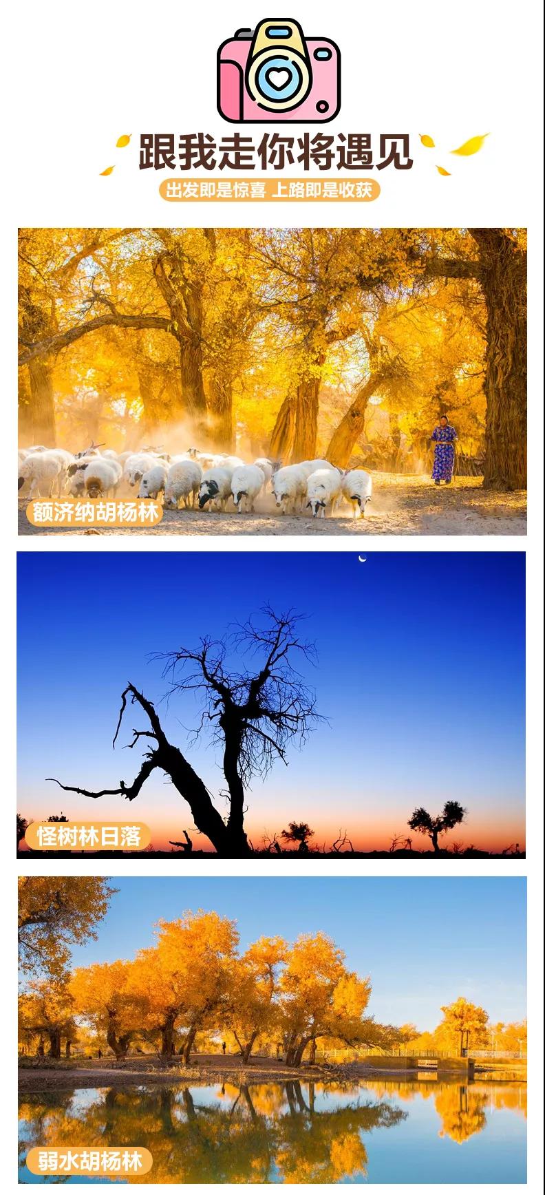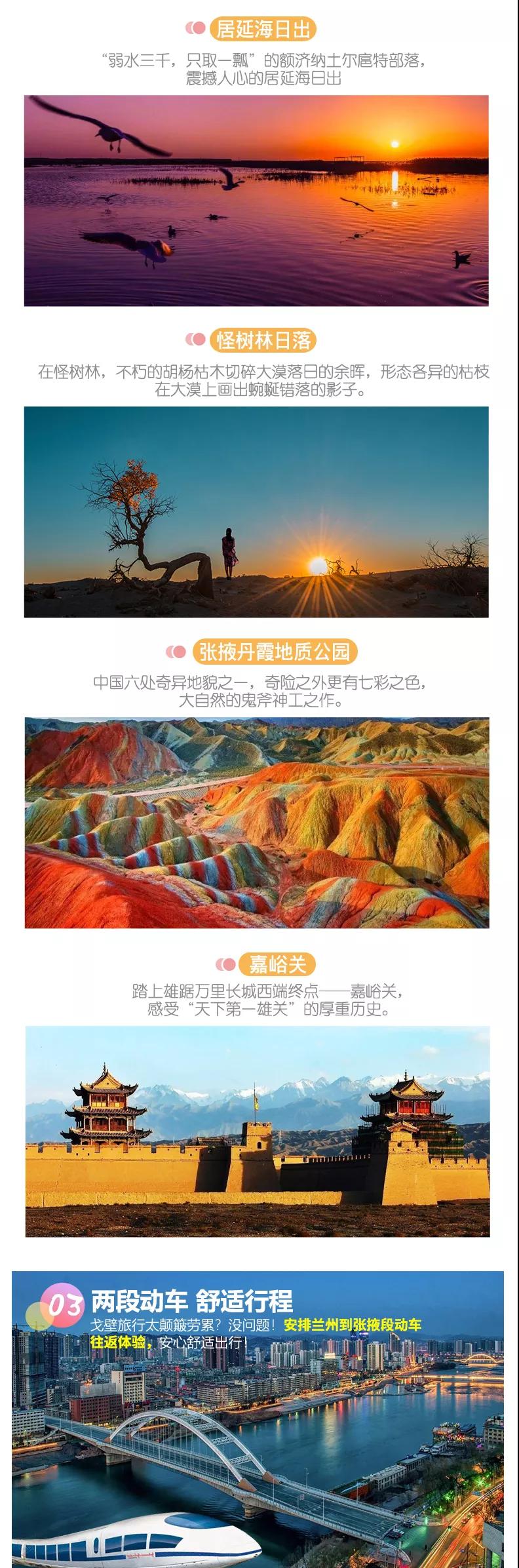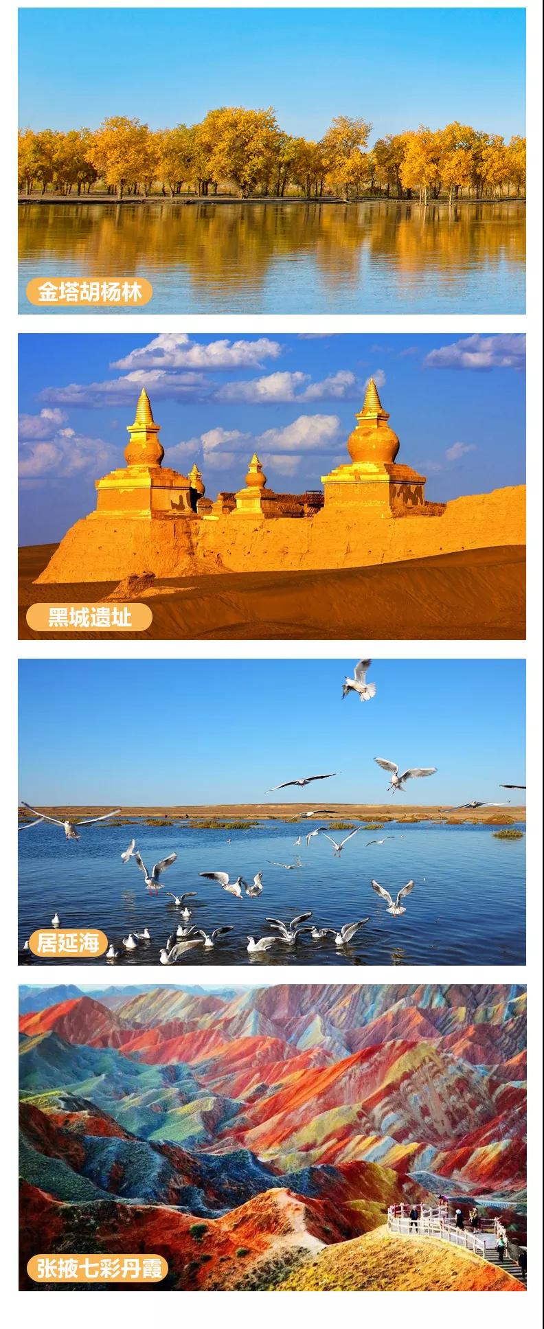 門票:含額濟納胡楊林、黑城-怪樹林-弱水胡楊林門票(含景區(qū)交通車)、居延海(含景區(qū)交通車)、張掖七彩丹霞地貌(含景區(qū)交通車)、嘉峪關(guān)城樓門票、策克口岸門票。
