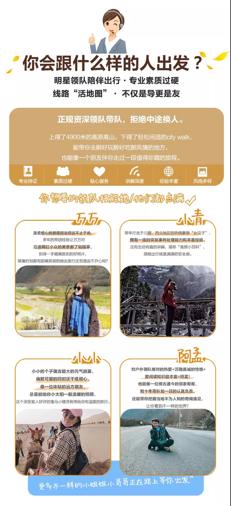 私人訂制:我們業(yè)務(wù)范圍囊括了全國各大城市,川西、西北、東北,在路上永遠有我們的身影。我們將為每一個有定制需求的你策劃出獨屬于自己的完美旅行。