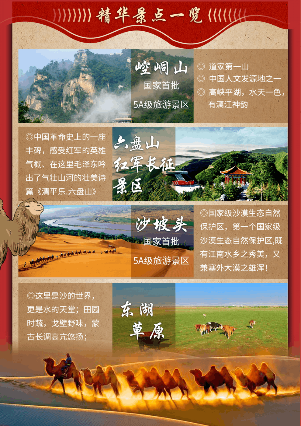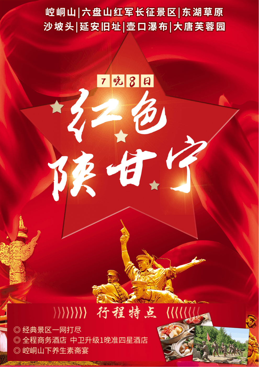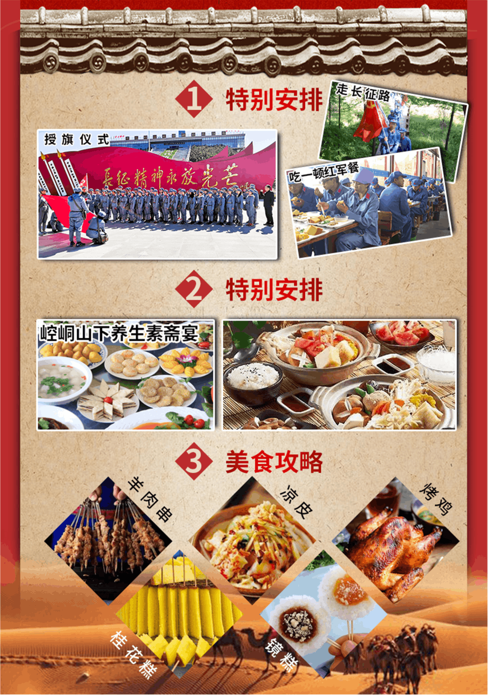 特別安排:【授旗儀式】—到達(dá)景區(qū),換上紅軍服裝,按照長(zhǎng)征中紅一、紅二、紅四方面軍的編制,分為三隊(duì)。由活動(dòng)領(lǐng)隊(duì)致辭,向各隊(duì)隊(duì)長(zhǎng)授旗!大家齊聲朗誦《清平樂.六盤山》,伴著“不到長(zhǎng)城非好漢”的壯志豪情,高舉紅軍旗,身著紅軍服向山頂進(jìn)發(fā)。