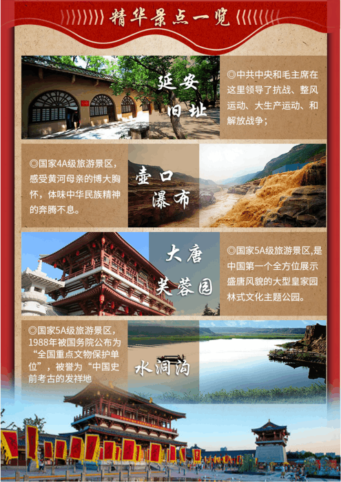 早餐后參觀【絲路銀川】該館全方位展現(xiàn)了桑養(yǎng)蠶業(yè),培育一批蠶繭基地,上規(guī)模、上水平,使中西部地區(qū)成為全國優(yōu)質(zhì)蠶繭資源基地。明確寧夏成為東桑西移工程的重要基地。絲綢有著5000多年的文化歷史,是我們中國的國粹,有得天獨(dú)厚種桑養(yǎng)蠶的自然條件,寧夏的蠶繭品質(zhì)名列世界前茅。參觀【水洞溝遺址】(游覽3小時(shí))水洞溝地區(qū)三萬年前人類繁衍生息的圣地。1923年,法國古生物學(xué)家德日進(jìn)、桑志華在這里發(fā)現(xiàn)了史前文化遺址,通過發(fā)掘,出土了大量石器和動(dòng)物化石,水洞溝因此而成為我國最早發(fā)現(xiàn)舊石器時(shí)代的古人類文化遺址。結(jié)束后乘車赴延安入住酒店休息!水洞溝—延安380公里,車程約5.5小時(shí)左右)
