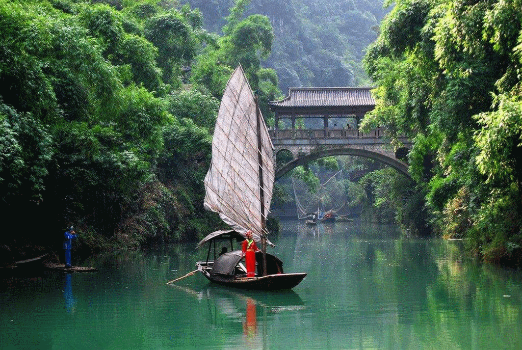【三峽人家風景區】依山傍水,風情如畫:傳統的三峽吊腳樓點綴于山水之間,久違的古帆船、烏篷船安靜地泊在三峽人家門前,溪邊少女揮著棒槌在清洗衣服,江面上悠然的漁家在撒網打魚……千百年來流傳不衰的各種習俗風情體現著峽江人民的質樸好客。