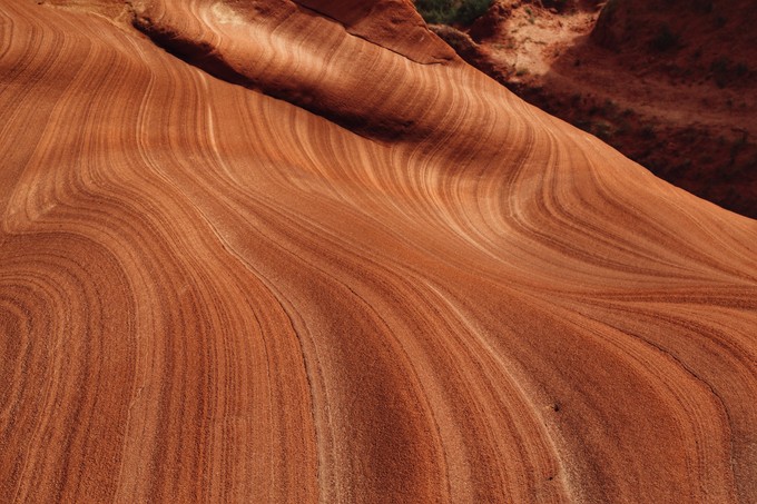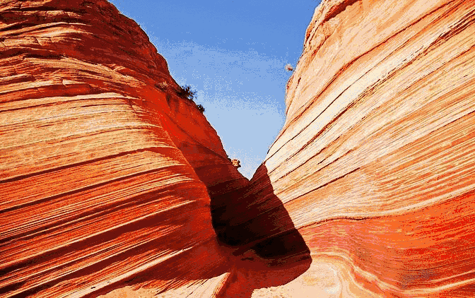 美西和陜北波浪谷,都是古老的沙丘隨著平原的上升,加上漫長(zhǎng)的風(fēng)蝕,水蝕,峽谷里砂巖的層次逐漸清晰地呈現(xiàn)出來(lái)。平滑的,雕塑感的砂巖和巖石上流暢的紋路創(chuàng)造了一種令人目眩的三維立體效果。二者也有一定區(qū)別,美西波浪谷在紅色之間夾有白色線(xiàn)條,紅白相間;而陜北波浪谷則以紅色為主。