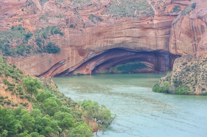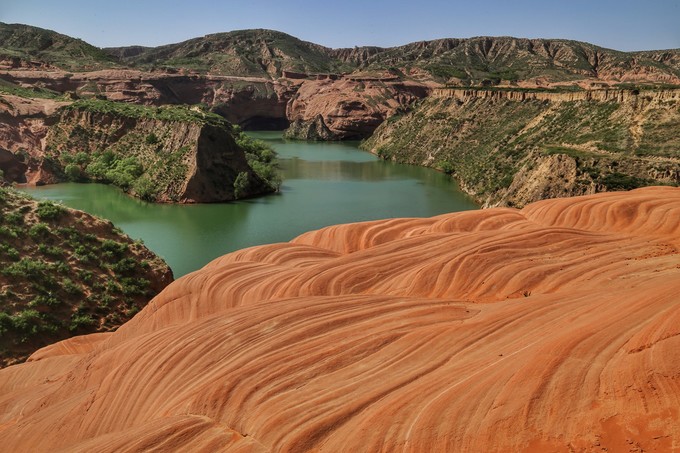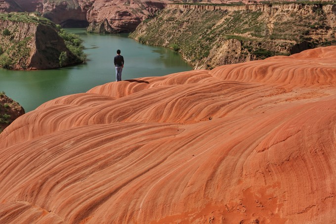 波浪谷景區(qū)位于陜西省靖邊縣城東南22公里處的龍洲鎮(zhèn),是典型的盆地型峽谷,這里紅巖環(huán)繞,綠水縈繞,方圓百公里都被紅色砂巖所覆蓋,與美國(guó)亞利桑那州的波浪谷非常相似, 亞利桑那州波浪谷紅色之間夾有白色線(xiàn)條, 靖邊波浪谷則以紅色為主。