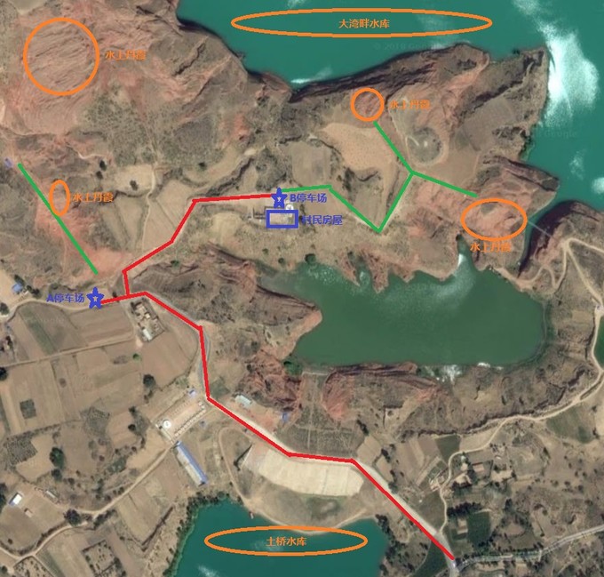 在龍州鎮(zhèn)北邊有幾處明顯的“水上丹霞”指示牌指向水上丹霞,過(guò)土橋水庫(kù)向前幾百米,A停車(chē)場(chǎng)就在路邊,停車(chē)前行就可以看見(jiàn)被圍欄圍起來(lái)的一片丹霞。B停車(chē)場(chǎng)設(shè)在當(dāng)?shù)匾粦?hù)農(nóng)民的院內(nèi),右手有一個(gè)農(nóng)民自己修建的岔路,進(jìn)去一兩百米就是了。