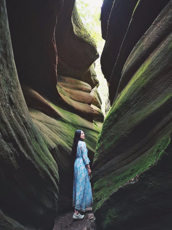 其中,沿著棧道走到最下面左轉(zhuǎn)的閆家寨附近的水面在修碼頭以后會(huì)有游船,右轉(zhuǎn)是所謂的一線(xiàn)天,到入口看了下里面很狹窄,加上雨季可能有落石不太安全就沒(méi)有進(jìn)入。這部分的特點(diǎn)是在峽谷底部的行走,景色沒(méi)有水上丹霞好。
